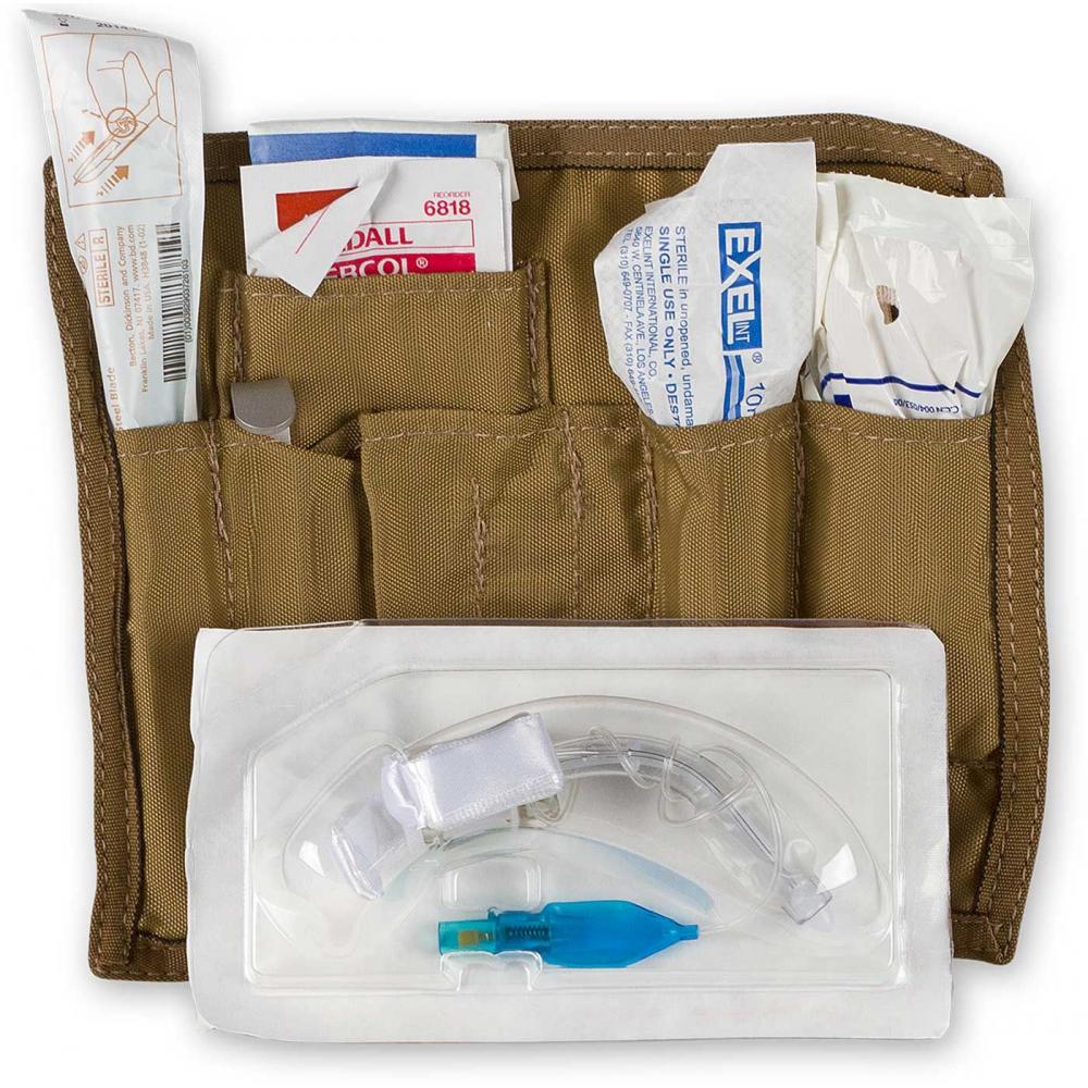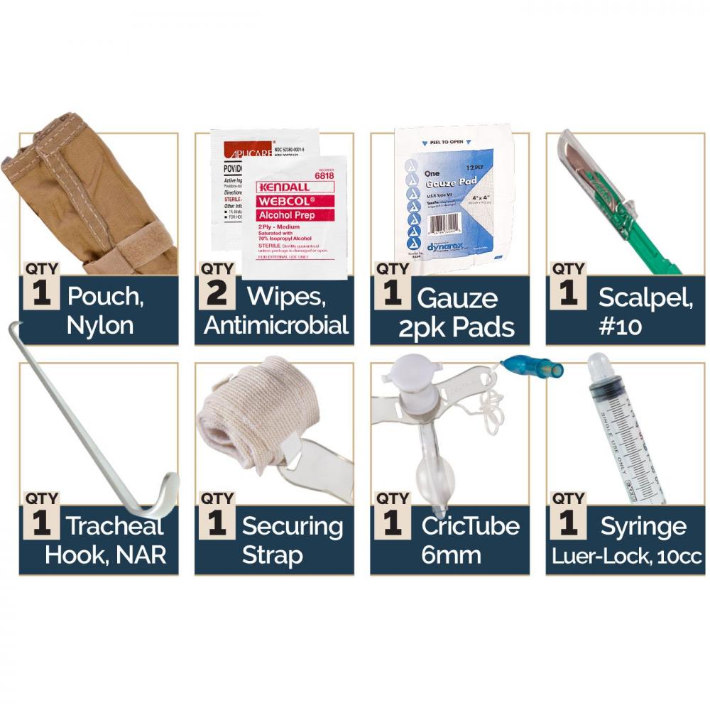 Supplying the operator with all the necessary tools to conduct a proper cricothyroidotomy in a low cube and ruggedized package, the Tactical CricKit® is the ideal kit for performing a cricothyroidotomy in austere environments. For ease in both training and live fire situations, it’s components are provided in the proper order of use. Once unrolled, the Tactical CricKit’s 500-denier pouch provides a clean working surface for the operator, making it viable for use in low-light and battlefield environments. The Tactical Crickit also provides the user with a tracheal tube that is both the ideal size and length, along with a securing device to aid in secondary treatment and CASEVAC. To combat microbial contamination, the Tactical CricKit® is supplied with alcohol pads for immediate disinfection, and povidone for long-term protection. The Tactical CricKit® was specifically engineered to meet CoTCCC requirements for a surgical airway kit.
